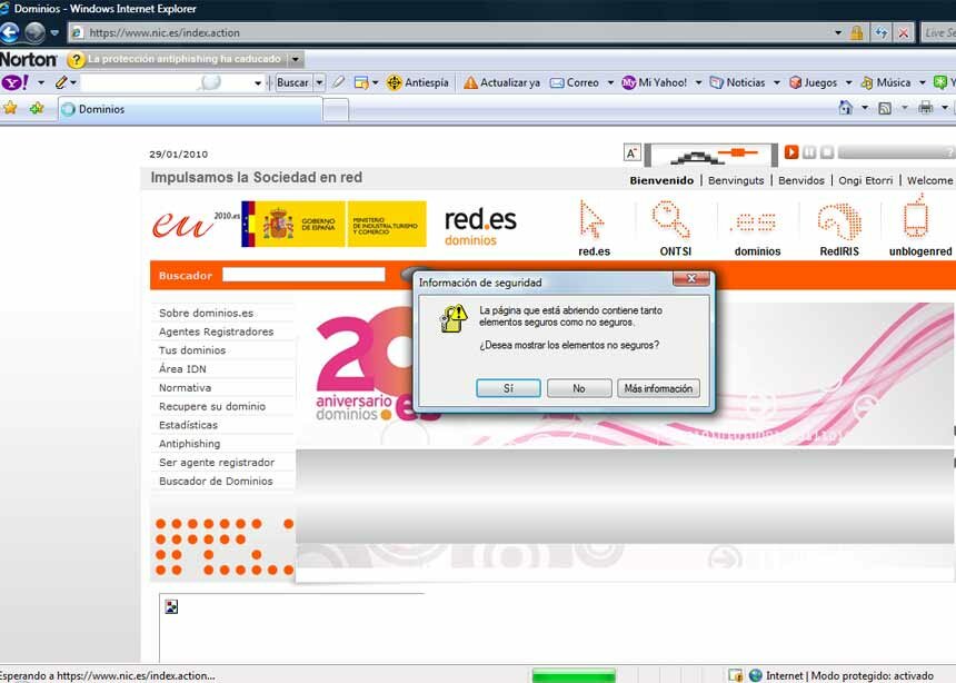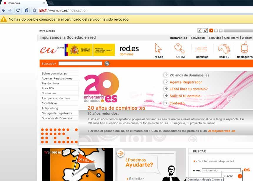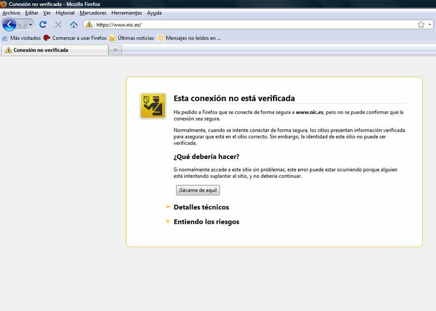 “avisos de seguridad que nos explican que la web tiene un fallo de seguridad” Lo único que significa ese mensaje es que la página en cuestión utiliza un certificado para cifrar la comunicación emitido por una entidad (CA) que el navegador no reconoce como CA de confianza. La CA que utiliza nic.es es la FNMT (Fábrica Nacional de Moneda y timbre). A mi me parece una entidad digna de toda confianza. El debate interesante sería porqué no se incluye a la FNMT como CA de confianza en los navegadores de España/descargados desde España.