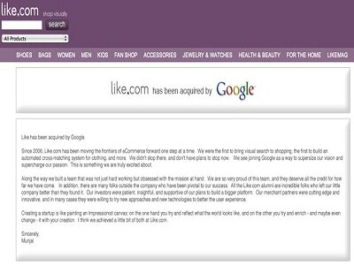 Según palabras del CEO de Like.com, Munjal Shah, “Hemos visto que unirse a Google es el camino para ampliar nuestra visión y alimentar nuestra pasión”. De momento, ni Google ni Like.com han dado detalles financieros de esta compra, pero se comenta que el gigante de Internet podría haber desembolsado 100 millones de dólares por hacerse con la compañía.